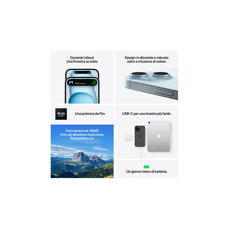 iPhone 15 e iPhone 15 Plus. Magia dinamica.\n\nCon Dynamic Island, fotocamera da 48MP e USB-C. E un robusto design in alluminio e in vetro a infusione di colore.\n\nCaratteristiche principali\n\nDYNAMIC ISLAND SU IPHONE 15 E 15 PLUS – La Dynamic Island ti mostra notifiche e attività in tempo reale, così non ti perdi nulla: puoi vedere chi ti sta chiamando, sapere se il tuo volo è in orario e molto altro.\n\nDESIGN INNOVATIVO – iPhone 15 e 15 Plus hanno un robusto design realizzato in vetro a infusione di colore e in alluminio. È a prova di schizzi, gocce e polvere (1). La parte frontale in Ceramic Shield è più forte di qualunque vetro per smartphone. E il display Super Retina XDR da 6,1\" (2) è fino a due volte più luminoso in pieno sole rispetto quello di iPhone 14.\n\nFOTOCAMERA PRINCIPALE DA 48MP CON TELEOBIETTIVO 2X – La fotocamera principale da 48MP scatta foto ad altissima risoluzione, per darti immagini splendide e incredibilmente dettagliate. E con il teleobiettivo 2x di qualità ottica è facile comporre l\'inquadratura perfetta per i tuoi primi piani.\n\nRITRATTI DI NUOVA GENERAZIONE – Scatta ritratti ancora più dettagliati e con colori più intensi. Inoltre puoi spostare la messa a fuoco su un altro soggetto, anche dopo aver scattato: basta un tap.\n\nPOTENTISSIMO CHIP A16 BIONIC – Il chip ultraveloce permette funzioni evolute come la fotografia computazionale, le transizioni fluide della Dynamic Island, e la modalità “Isolamento vocale” per le chiamate. Ed è anche incredibilmente efficiente, così la batteria dura tutto il giorno (3)\n\nCONNETTIVITÀ USB C – Il nuovo connettore USB C ti permette di caricare il Mac o l\'iPad con lo stesso cavo che usi per il tuo iPhone 15 e 15 Plus. E ora puoi anche usare l\'iPhone 15 e 15 Plus per caricare il tuo Apple Watch o gli AirPods.\n\nFUNZIONI DI SICUREZZA – Se devi chiamare i soccorsi ma non c\'è campo o non ci sono reti Wi-Fi disponibili, puoi usare SOS emergenze via satellite (4). E con Rilevamento incidenti, iPhone può riconoscere un grave incidente d\'auto e chiamare aiuto se tu non puoi (5)\n\nPENSATO PENSANDO A TUTTO – iPhone ha funzioni che proteggono la tua privacy e ti aiutano a tenere sotto controllo i tuoi dati. È realizzato con ancora più materiali riciclati per ridurre al minimo l\'impatto ambientale. E include di serie funzioni che lo rendono accessibile a ogni persona.\n\nNote legali\n(1) iPhone 15, iPhone 15 Plus, iPhone 15 Pro e iPhone 15 Pro Max resistono agli schizzi, alle gocce e alla polvere; sono stati testati in laboratorio in condizioni controllate, con un rating di grado IP68 (profondità massima di 6 metri fino a 30 minuti) secondo lo standard IEC 60529. La resistenza agli schizzi, alle gocce e alla polvere non è una caratteristica permanente e potrebbe diminuire con la normale usura. Non tentare di ricaricare il tuo iPhone quando è bagnato; consulta il manuale per pulirlo e asciugarlo. I danni da liquidi non sono coperti dalla garanzia limitata di un anno di Apple. I danni da liquidi potrebbero essere coperti dalla tua garanzia legale di conformità. \n(2) Il display è un rettangolo dagli angoli arrotondati; se si considera il corrispondente rettangolo con gli angoli retti, la diagonale misura 6,12\" (iPhone 15 Pro, iPhone 15) o 6,69\" (iPhone 15 Pro Max, iPhone 15 Plus). La superficie effettiva di visualizzazione è inferiore.\n(3) La durata della batteria varia a seconda dell\'uso e della configurazione; vai su apple.com/it/batteries per saperne di più.\n(4) Il servizio è incluso gratuitamente per due anni con l\'attivazione di qualsiasi modello di iPhone 15. I tempi di connessione e risposta variano in base alla posizione geografica, alle condizioni ambientali e ad altri fattori. Vai su support.apple.com/kb/HT213885 per saperne di più.\n(5) iPhone 15 e iPhone 15 Pro possono riconoscere un grave incidente d\'auto e chiamare i soccorsi. Questa funzione richiede una connessione cellulare o l\'attivazione delle chiamate su rete Wi Fi.\n\nSpecifiche tecniche \nTutte le specifiche sono su apple.com/it/iphone/compare